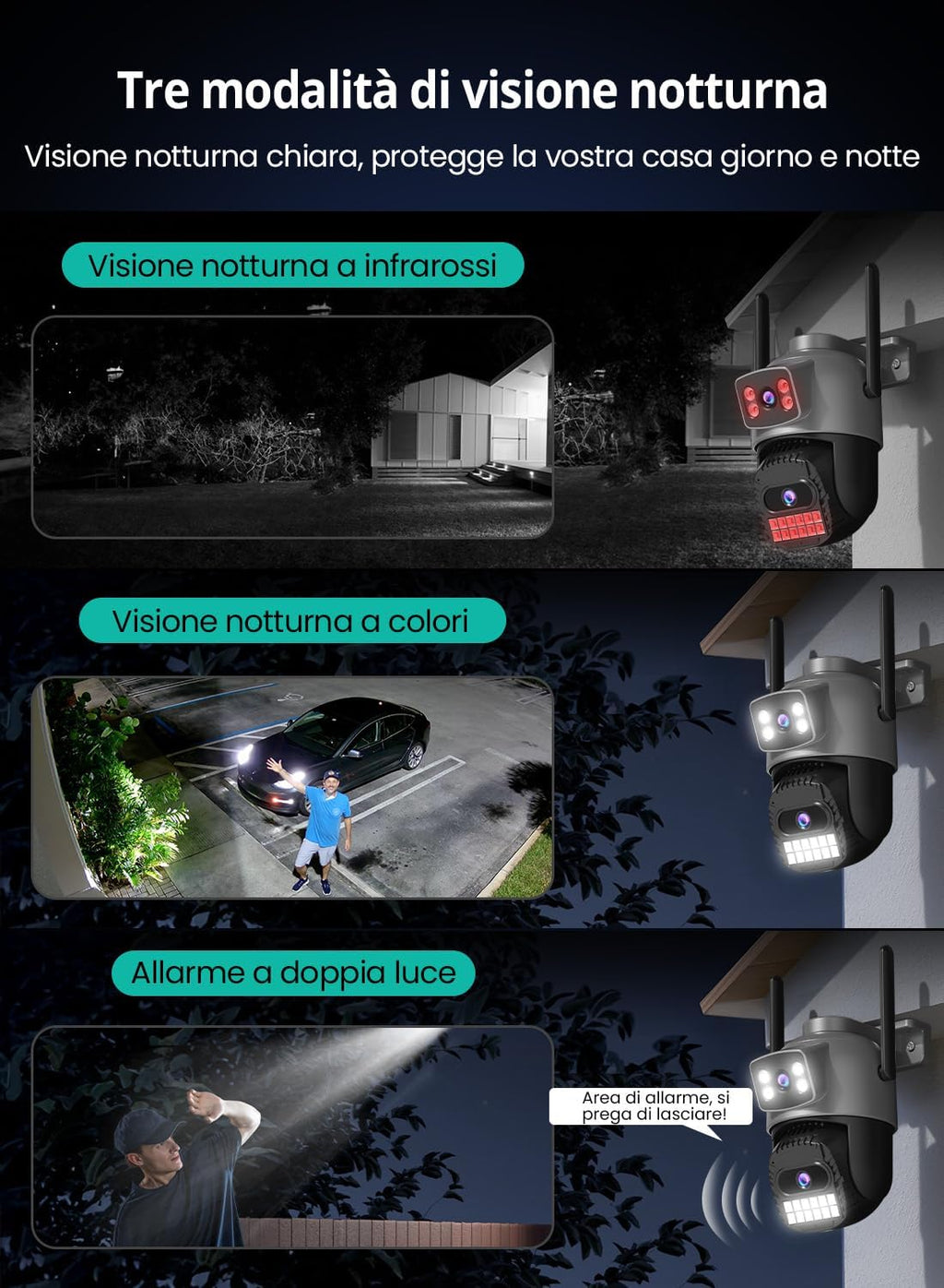 Anche di notte, la visione notturna avanzata garantisce immagini chiare e definite, così potrai vedere chiunque si avvicini alla tua proprietà senza alcuna incertezza.