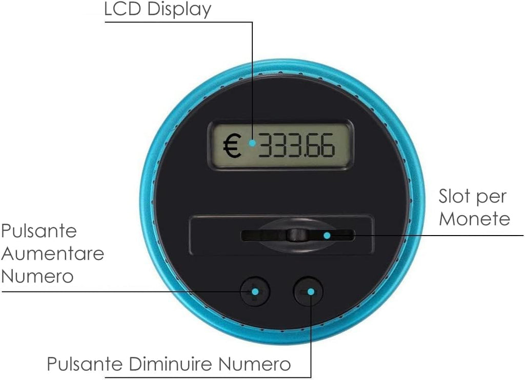- [Conteggio Automatico] - Il barattolo per il risparmio è dotato di uno schermo LCD sul coperchio che aiuta a calcolare il numero di monete nella fessura. Calcola accuratamente il denaro e visualizza l'importo totale di ogni deposito. Inoltre, i pulsanti +/- sul coperchio consentono un'impostazione manuale molto semplice